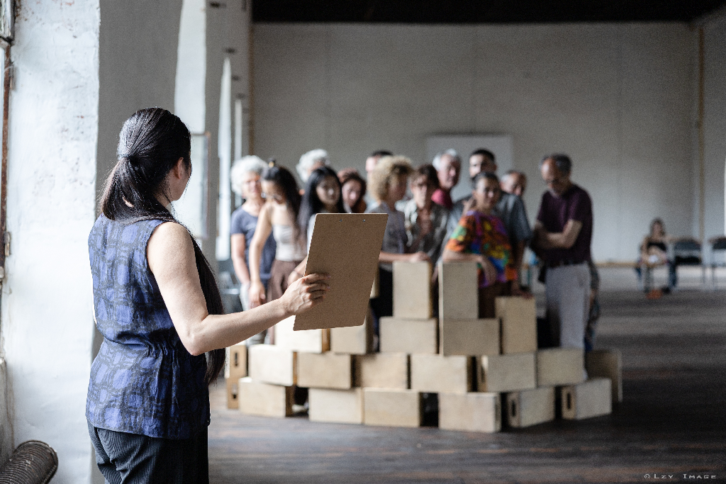 L'artiste donne des consignes aux participant.es que ces derniers interprètent selon leur personnalité, leur terreau culturel et leur imagination. Les consignes peuvent etre être collectives ou individuelles. Elles conduisent souvent à la coopération silencieuse des corps.